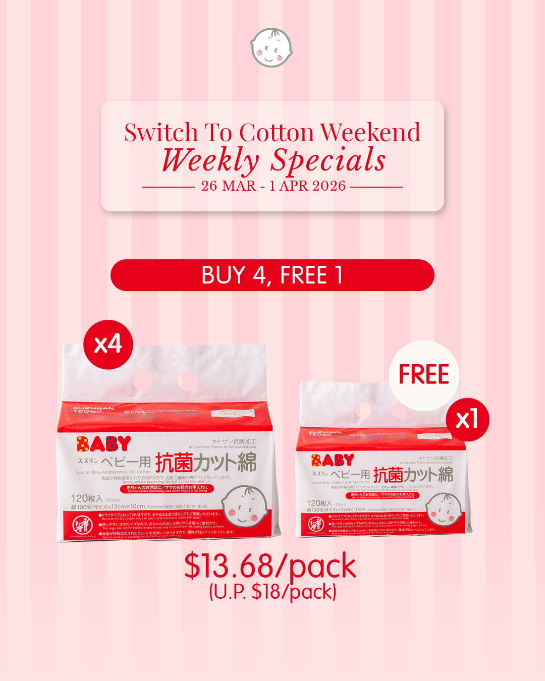 5packs @ $13.68/pack (U.P. $18) Antibacterial Cut Cotton 120pcs (Buy 4 Free 1)