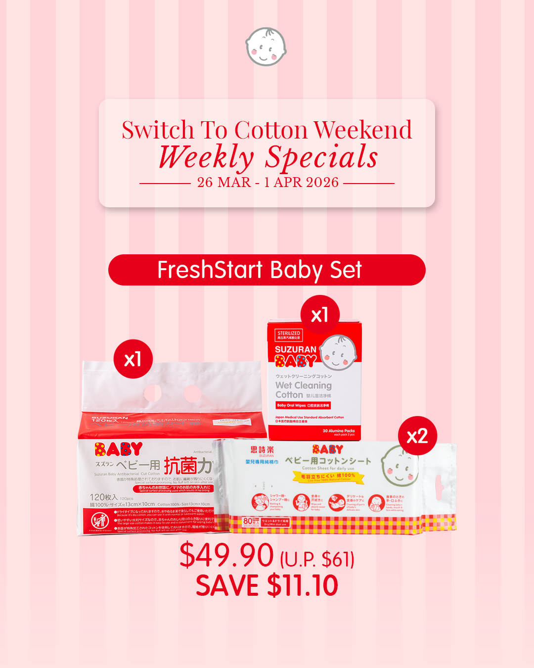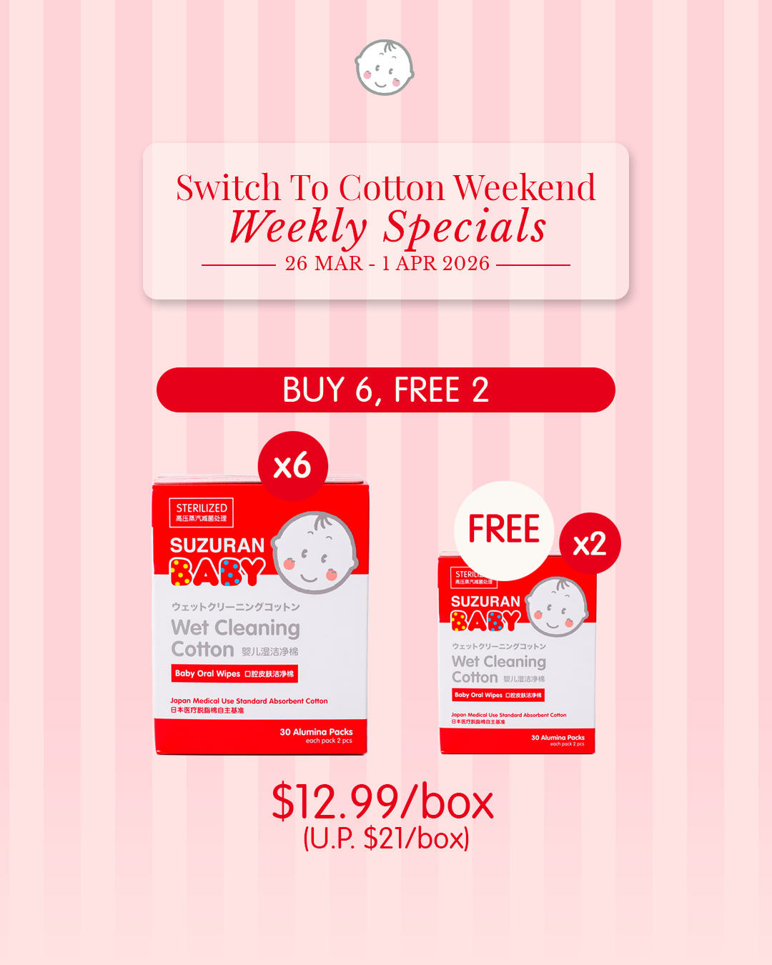 8packs @ $7.49/pack (U.P. $11) - Antibacterial Cut Cotton 80pcs (Buy 6 Free 2)